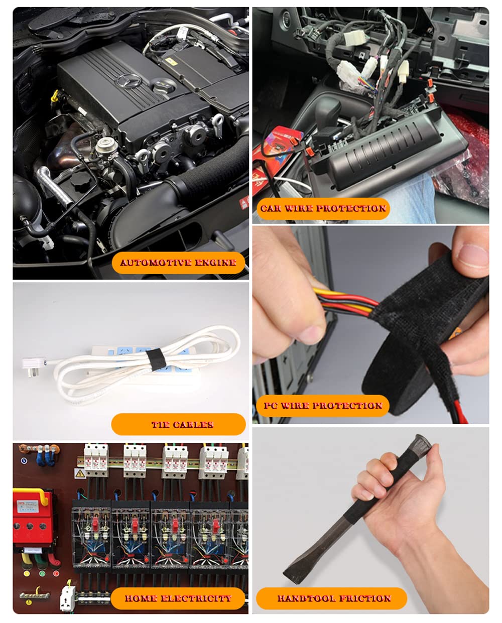 PRODUCT PARAMETER: : Carrier Material: Fabric Cloth Adhesive Type: Silicone, Pressure Sensitive Thickness: 0.17 ± 0.03 Work Temperature:-40℉-302℉ Tensile Strength: ≥45 N/cm Self Fusing Strength: ≥1.8 N/cm Elongation: ≤3% Unwind Strength: 3 - 10 N Fire Resistance: ≤100 mm/min Noise Reduction: >2 ~ ≤5 dB PRODUCT FEATURE: : - High temperature resistance from -40℉-302℉. - Silicone adhesive, gooey and residue free for long term use. - Durable lifespan against scuff or rip. - Easy to tear and wrap by hand for maintenance and repair. - Compatible to rubber, plastic, steel, wood and so on. - Sticks and fuses to itself incredibly well. - Professional clean look while protecting against heat and engine bay conditions. - Work better for wiring harness comparing to OEM and electrical tape. - 3 rolls wrap packed together.