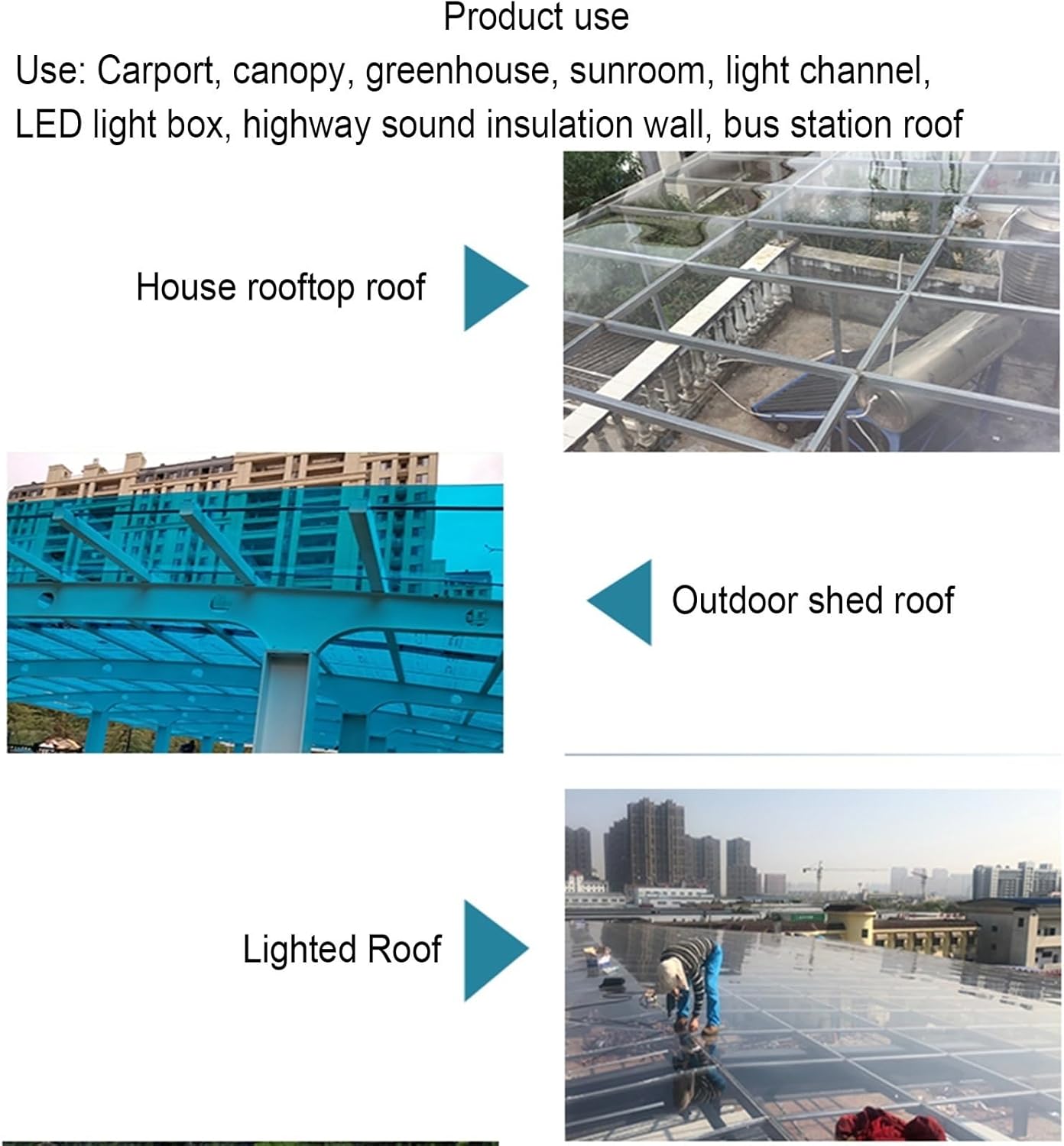 Sunlight panel transparent canopy Lighting greenhouse greenhouse outdoor heat insulation flat plate endurance plastic tiles rain shadeProduct Name: FRP Lighting PanelMaterial: new polyester resin + imported glass fiberColor: transparentThickness: 0.8mmWidth: 1.0m,1.2mProduct features:Flat and glossy, no black spots or bubbles on the surface, smooth to the touch, all made by machine cutting.Scissors can be cut dovetail screws can be fixed to save time and effort!Warm tips:Size are measured manually, there may be 1~2cm error, please prevail in kind please forgive me!Best service: We provide quality service, if you have any questions, please contact us, we will provide you with 100% satisfactory solution within 24 hours!LYWY is a company that focuses on product quality. It is a manufacturer of housewares and storage devices. Since its establishment in 1998, the company has developed into a diversified enterprise integrating R&D, design, production and sales. The production and management include outdoor products, storage shelves and other series of products