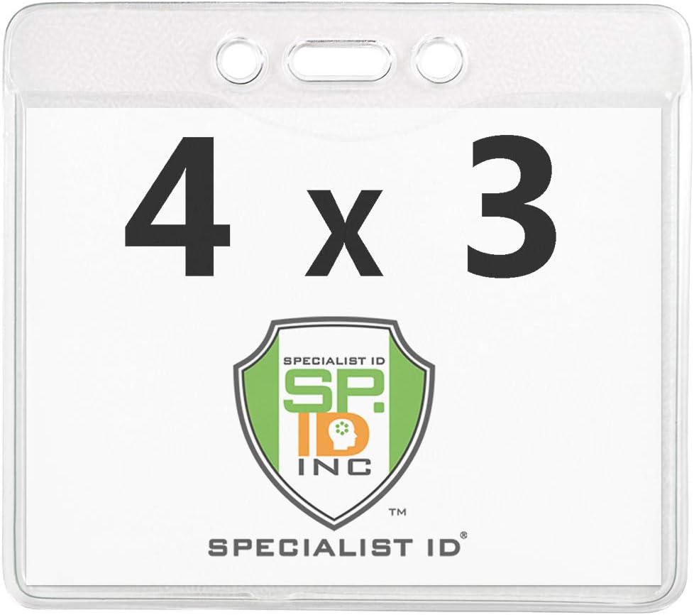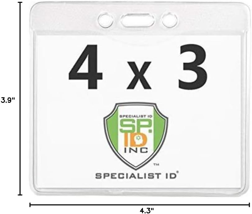 The Specialist ID textured horizontal 4 x 3 size badge holder is made with top quality vinyl for professional use. Slot and chain holes let you attach it to any lanyard, neck cord or badge reel strap. This is the perfect size holder to use for a vaccination card protector, trade show badge, conference nametag cover or other required documentation for entry to fly or attend a convention. Thin, flat, flexible yet sturdy, these holders fit easily in luggage or travel bags when not in use and are a great economical choice for the team, staff, group. company, volunteers or students for field trips, outdoor retreats and theme park adventures. Easy to slide in your printable inserts, laminated cards or ID badge from the top opening vinyl sleeve for visibility on one side. Great for displaying your CDC proof of vaccine card, health certificate or other necessary medical record history during current circumstances. Practical for DIY nametags or ID badges for classroom activities, family or school reunions, poll officers during elections, work contests, fundraiser, social event, festivals, conference tickets, travel, PTA, student orientation, trade show, game trade collector card conventions and more, Convenient slot and chain holes allow you to attach your standard, promotional lanyard or badge reel strap clip to hang or hide your visible ID photo badges or important healthcare documents under a jacket or over a shirt. Barcodes can also be scanned through the vinyl material by any scanner reader.