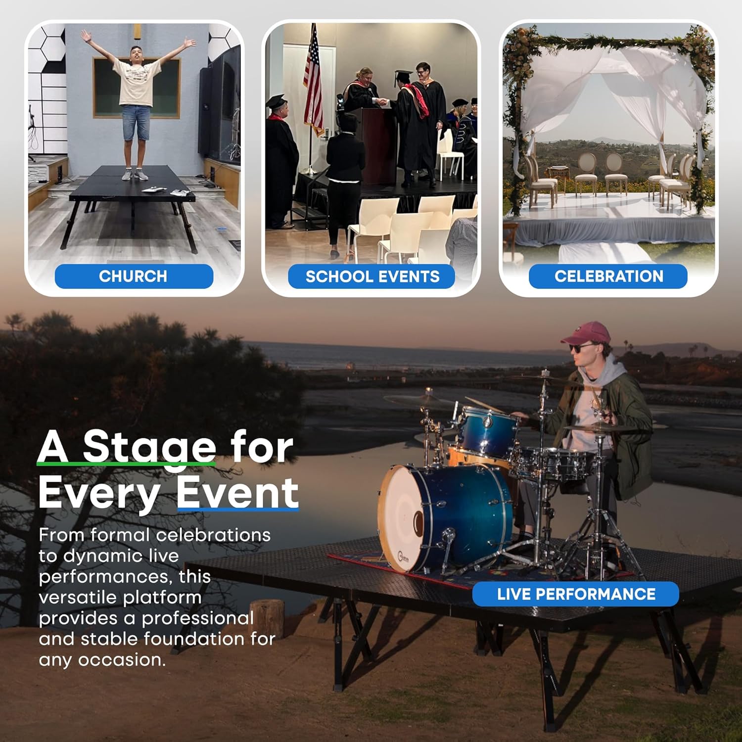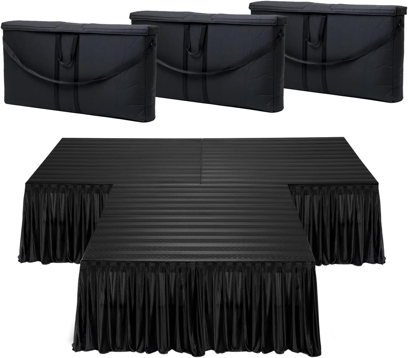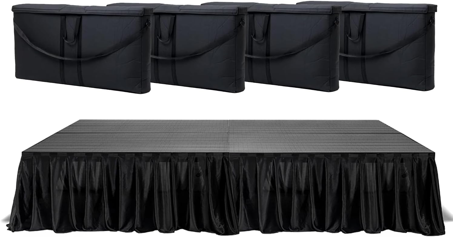 ELEVATE YOUR EVENTS WITH MYSTAGE PORTABLE STAGE PACKAGE Transform your performances and events with the MyStage folding portable stage, complete with a sleek stage skirts black and durable duffle bag. Designed for versatility, this event stage platform provides a flat, stable surface for classrooms, theaters, or outdoor venues. Its wrinkle-free skirt delivers an elegant touch, while the heavy-duty gear bag ensures your setup is always organized and ready to go. SEAMLESS DESIGN AND EASY SETUP Experience effortless setup with the MyStage system. The platform stage skirt features a Velcro strip for fast installation, eliminating the need for clips or tools. Adjustable tabs allow you to customize the skirt height to match your platform. Whether you’re hosting a performance or a formal event, this stage table skirt decorated rectangular stage solution guarantees a polished appearance in minutes. DURABLE MATERIALS FOR LONG-LASTING PERFORMANCE Crafted from luxurious velour fabric, the skirts for stage platform is wrinkle-free, stain-resistant, and easy to maintain. The large gear bag, built with reinforced seams and tear-resistant material, ensures secure transport for your stage components. With features like a central storage compartment and adjustable shoulder strap, this package is designed for durability and convenience. FEATURES AND BENEFITS -Luxurious Velour Fabric -Fixed or Variable Heights -Quick Velcro Installation -Portable Design -Heavy-Duty Gear Bag -Ample Storage Space -Outdoor Show Resistant -60-Day Manufacturer Warranty -Package Includes: 1 x 1 MyStage with 1 skirt, and 1 gear bag package