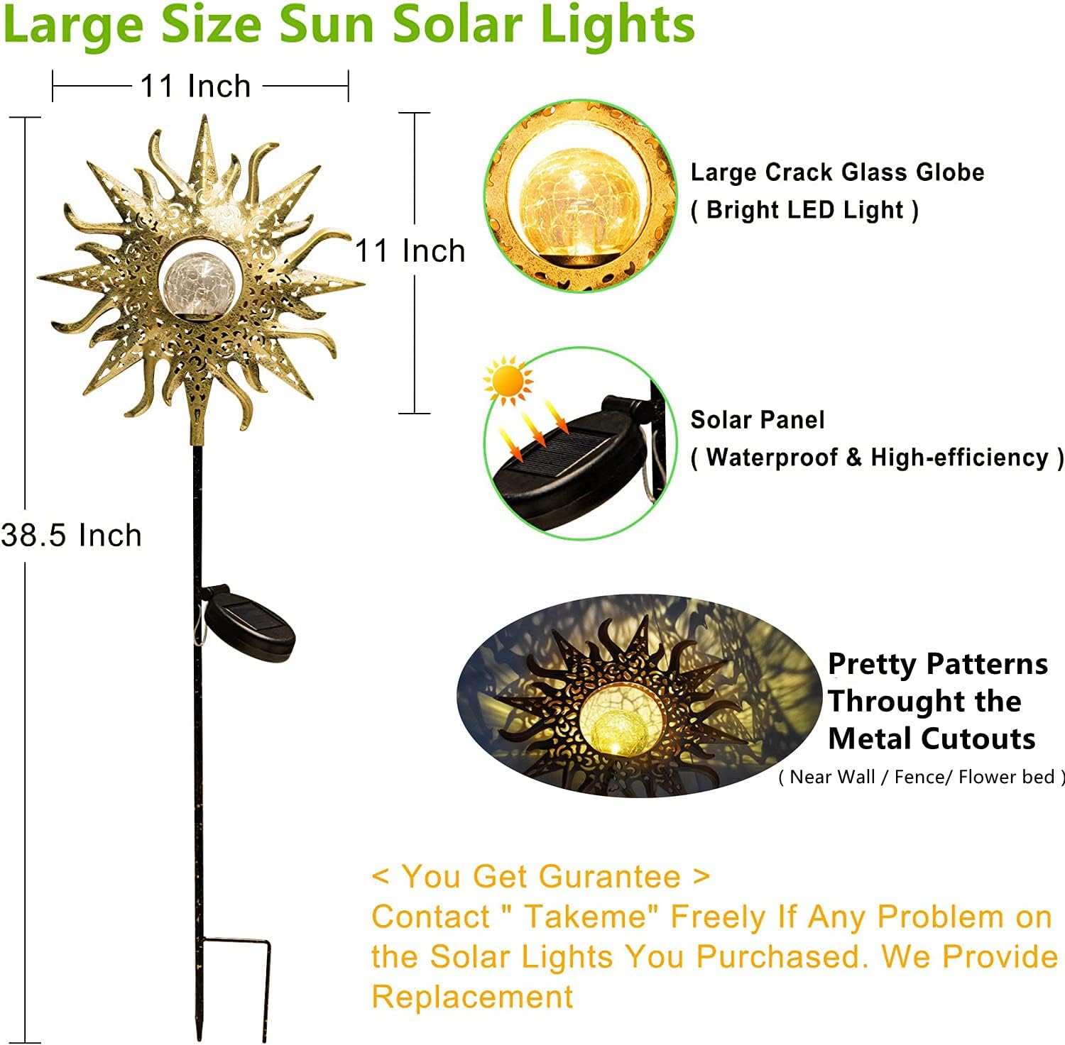 Make sure the button is in the “ON” position before change it in the sun.If the button is in “on” position,keeping the solar panel in the darkness,then the lights will light up.Simply contact us if you ever have issues with your TAKE ME lights