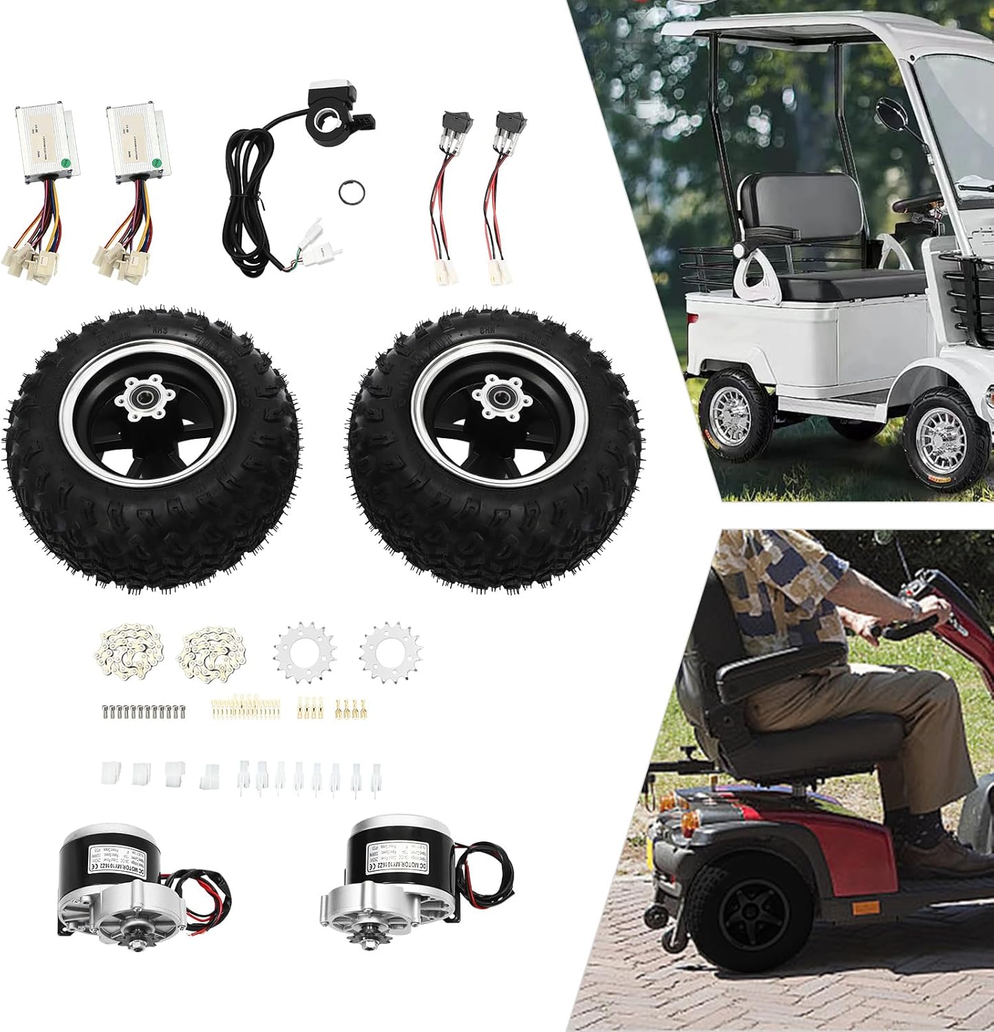 DescriptionIf you are looking for a professional and safe kit for your scooter, then our set can be an ideal choice. Our products are made of high-quality materials and are built to last. Complete accessories are available to meet your needs.It is efficient and safe to use, providing a guarantee for your riding.DetailsLarge Wheels: 10inch diameter wheels with anti-skid design can easily handle most road conditions.Reverse Gear Switch: It solves the problem of traditional scooters that are difficult to reverse in narrow spaces or on steep ramps. It enables you to maneuver your scooter more safely and conveniently when you need to reverse, improving the flexibility and practicality of your vehicle.ApplicationThis product is suitable for small go-karts, electric wheelchairs and senior mobility scooters.SpecificationMaterial: Copper, Iron, Aluminum, Magnetic and RubberAssembly Required: YesMotor Type: Brush Gear MotorRated Voltage: 24VOutput Power: 250WUnload Current: ≤2.2ARated Current: ≤13.4A Unload Speed: 370rpmRated Speed: 330rpmRated Torque: 0.8N.mEfficiency: ≥80% Gear Ratio: 9:7:1Insulation Class: FProtect Grade: IP33Speed: 10km/6.21mile/hWheel Diameter: 25.4cm/10inAxle Hole Diameter: 12mm/0.47inLoad Capacity: About 150-200kg/330.69-440.92lbsGross Weight: 16kgPackage Included2* Wheels2* Motors1* Thumb Throttle (with Battery Indicator Lights & Button Switch)Notes1.Please note that this product cannot change gears, you can adjust the speed by throttle.2.Please note that this kit does not include batteries, you need to buy batteries separately, lead-acid batteries and lithium batteries are available, recommended battery capacity is 24V 15Ah.3.Please note that the wheels are vacuum tires without tubes.