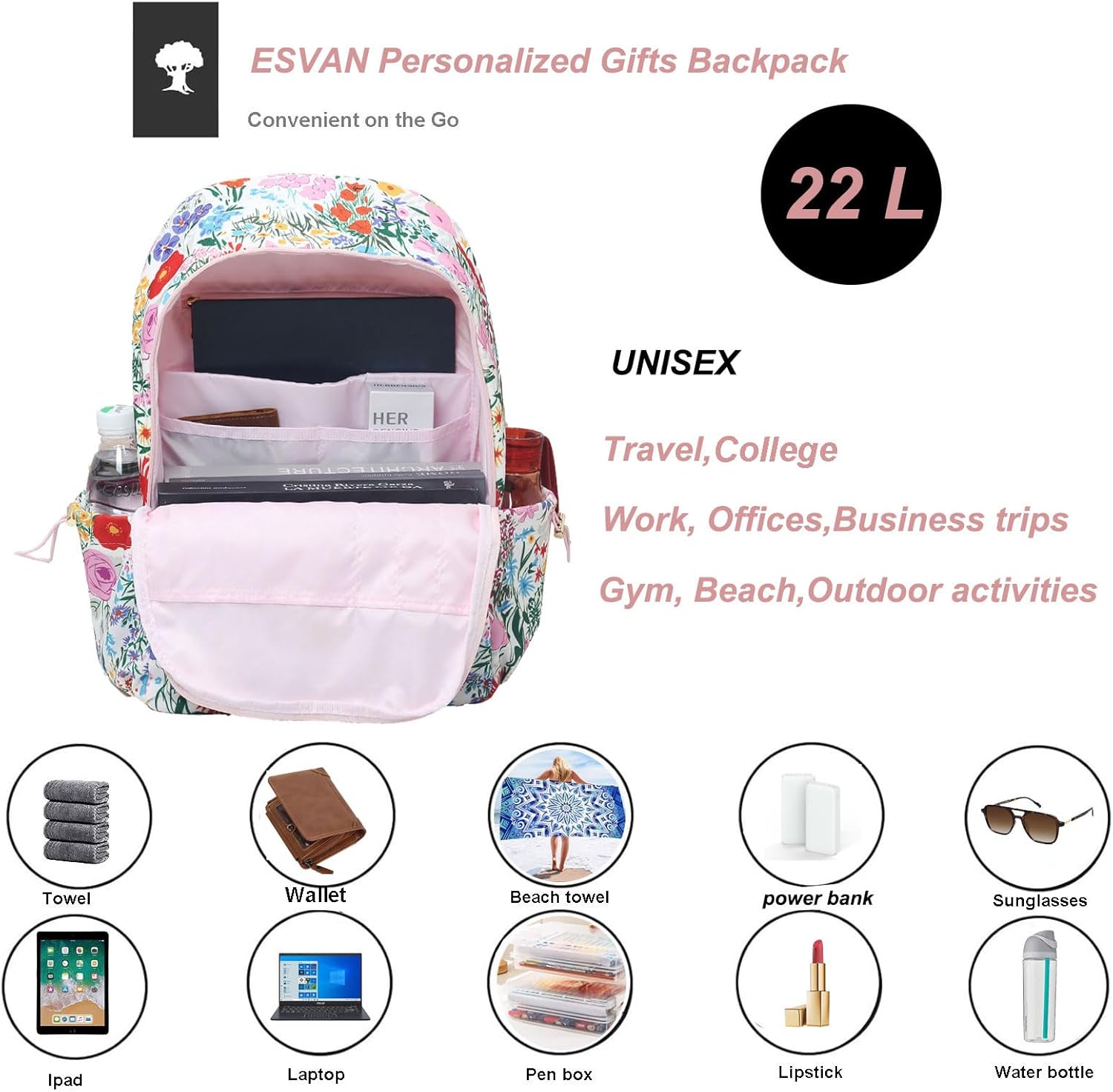A Cool Lovely Backpack Filled With Esvan Team's Care and Love For You ①Many Fashion colours for your Choices,you’ll find one that fits your style and fashion sense ②Super lightweight(0.45kg), durable & All Water Resistant fabric, easy to wipe clean ③ Padded Soft shoulder straps offer all day comfort ④Waterproof do not afriad rain anymore. ⑤Non toxic - BPA and phosphate free, no smell at all ⑥Fashion and unisex backpack, perfect for your family. ⑦Front zippered Roomy Compartment for additional storage ⑧Adjustable Stroller Straps is a must when go out ⑨Metal zipper ⑩Lifetime Warranty - Buy with confidence, our support team is only a message away. ⑪Personalized Gifts Backpack . ... Perfect For Travelling. A nice companion. Not only that but most of all he is a lightweight alternative to Shoping,Sport,Gym,Beach.Lightweight design,Easy to open and carry. What You Will Get In The Package? 1 x backpack
