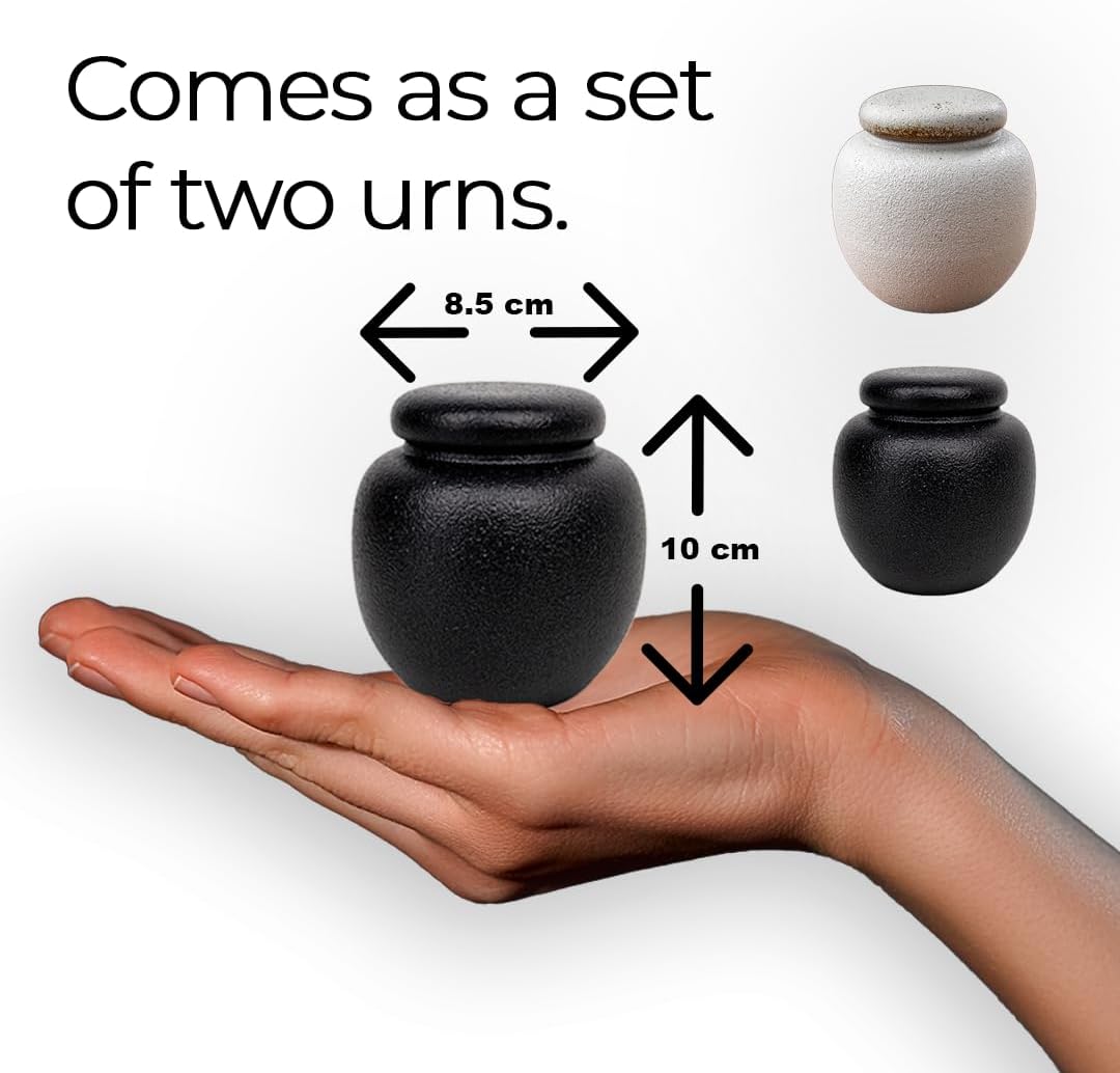 Celebrate the memory of your loved ones with this Set of 2 Ceramic Keepsake Urns, featuring one elegant black urn and one classic white urn. Together, the contrasting colors create a timeless symbol of balance and remembrance, making this set a meaningful choice for honoring the life of someone dear. Crafted from durable ceramic, each urn provides both elegance and strength, ensuring a dignified resting place for human or pet ashes. The secure-fitting lids protect the contents, giving families confidence that memories will be preserved with care. Designed with versatility in mind, these miniature urns are perfect for sharing ashes among family members or keeping a small portion close by as a lasting tribute. Their compact size and refined appearance allow them to blend seamlessly into any memorial setting, from a mantel to a bedside table. With one black and one white urn included, this set offers a unique and symbolic way to honor your loved ones while keeping cherished memories close at heart.