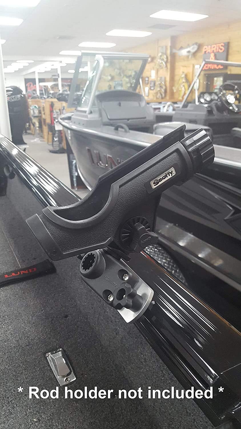 ROD HOLDER NOT INCLUDED. Our rod holder mounting bracket is compatible with Lund boats equipped with the Sport Track built-in track system. It fits straight and angled gunwale track systems as shown in the photos. Our brackets feature a compact design at 2” wide by 6-1/2” long with easy access knobs, and all stainless steel hardware. Brackets are pre-drilled and tapped to fit rod holders from Scotty, Cabela’s, Cannon, RAM and others. Includes stainless steel machine screws for mounting the rod holder to the bracket. Installation is fast and easy!Rod holders can be installed on our brackets and the brackets can be installed onto your boat in literally a couple minutes. Rod holder is not included.Once installed a simple loosening of the knobs allow you to slide your rod holder into a new position on the gunwale then tighten the knobs to lock it into position.Our brackets feature our exclusive ULTRA-TEX textured then anodized finish to cut glare and provide just the right amount of sheen. CNC precision machined from marine grade aluminum in the USA by Depth Raider Marine Products. We use thicker aluminum than some manufacturers, use our CNC machines to round the ends then drill and tap the holes so there are no bolts or nuts sticking out on the back side, and no rough edges to scratch your boat. Other manufacturers use thin aluminum which requires spacers since you will need nuts on the back side to hold the rod holder in place. Also, other manufacturers don’t include the machine screws to mount your rod holders. So now it’s a trip to the hardware store. As far as finish is concerned, some manufacturers leave the aluminum bare, and some paint with a spray can. Ours are anodized. One thing is for sure - anodizing is the best way to protect aluminum from the elements. It hardens the surface of the aluminum, it looks great, won’t scratch easily or rub off. This listing is for a single mounting bracket with knobs and machine screws.